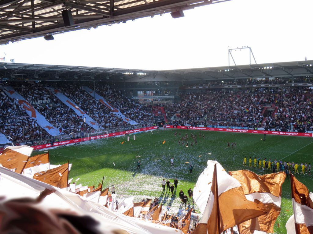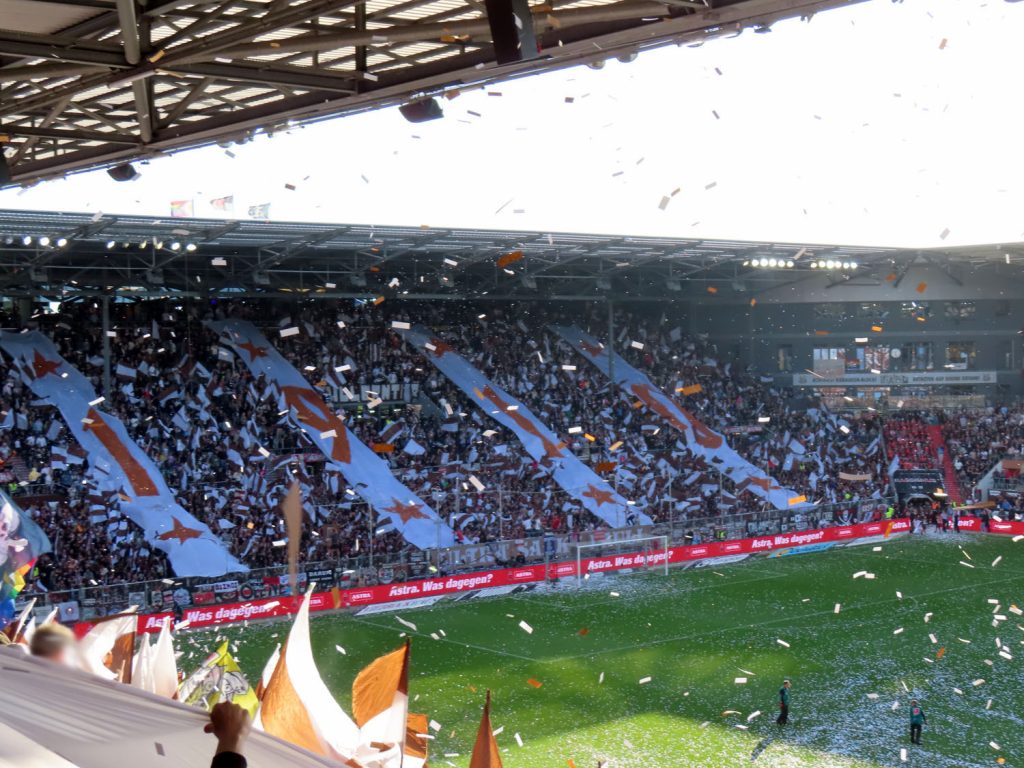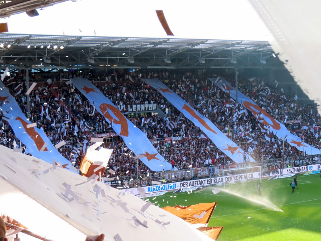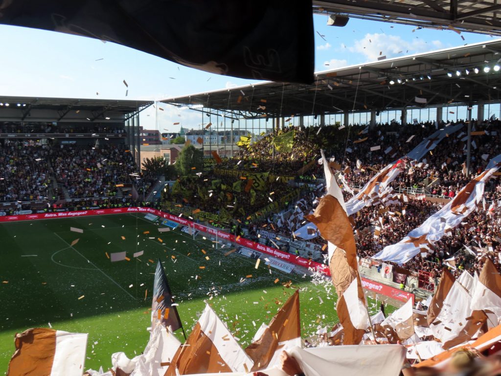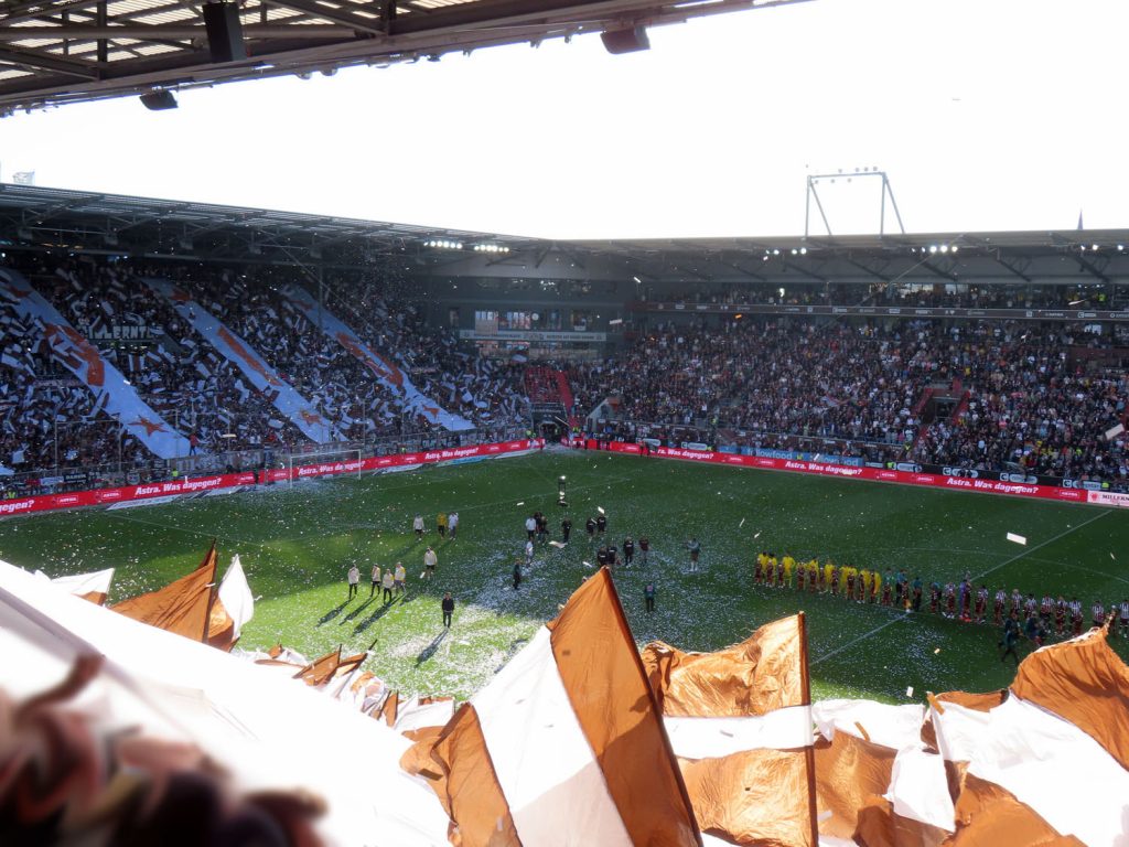 Unfaßbar viel Konfetti in jedem Fall. Am Millerntor gibt es ja immer mal wieder wahre Konfetti-Orgien, aber der vergangene Spieltag war in dieser Hinsicht einfach ein unerreichbarer Rekord. Es hätte nicht viel gefehlt und das Spiel hätte entweder unterbrochen oder mit Verspätung angepfiffen werden müssen, um all die Papieschnipsel auf dem Rasen zu entfernen – was absurderweise bei so einer harmlosen Choreo eine hohe Geldstrafe nach sich gezogen hätte, insofern haben wir da wirklich Glück gehabt.