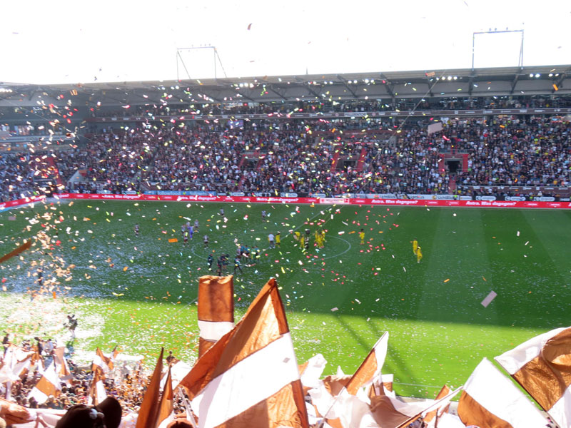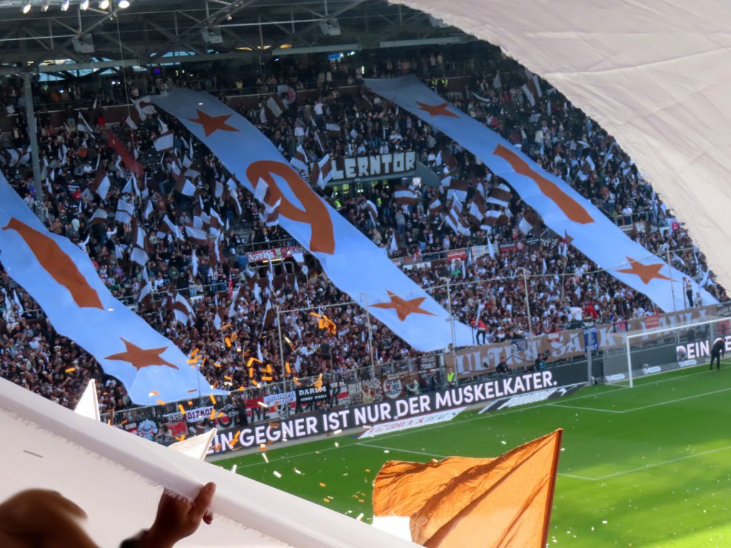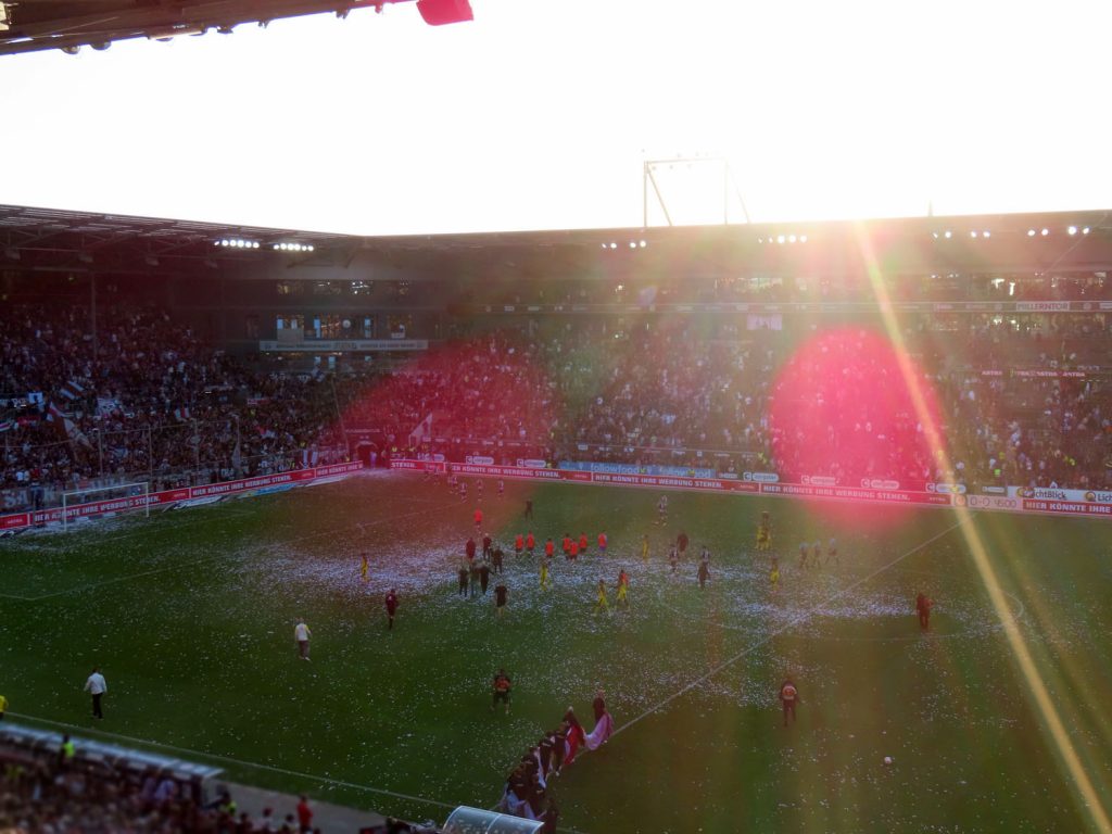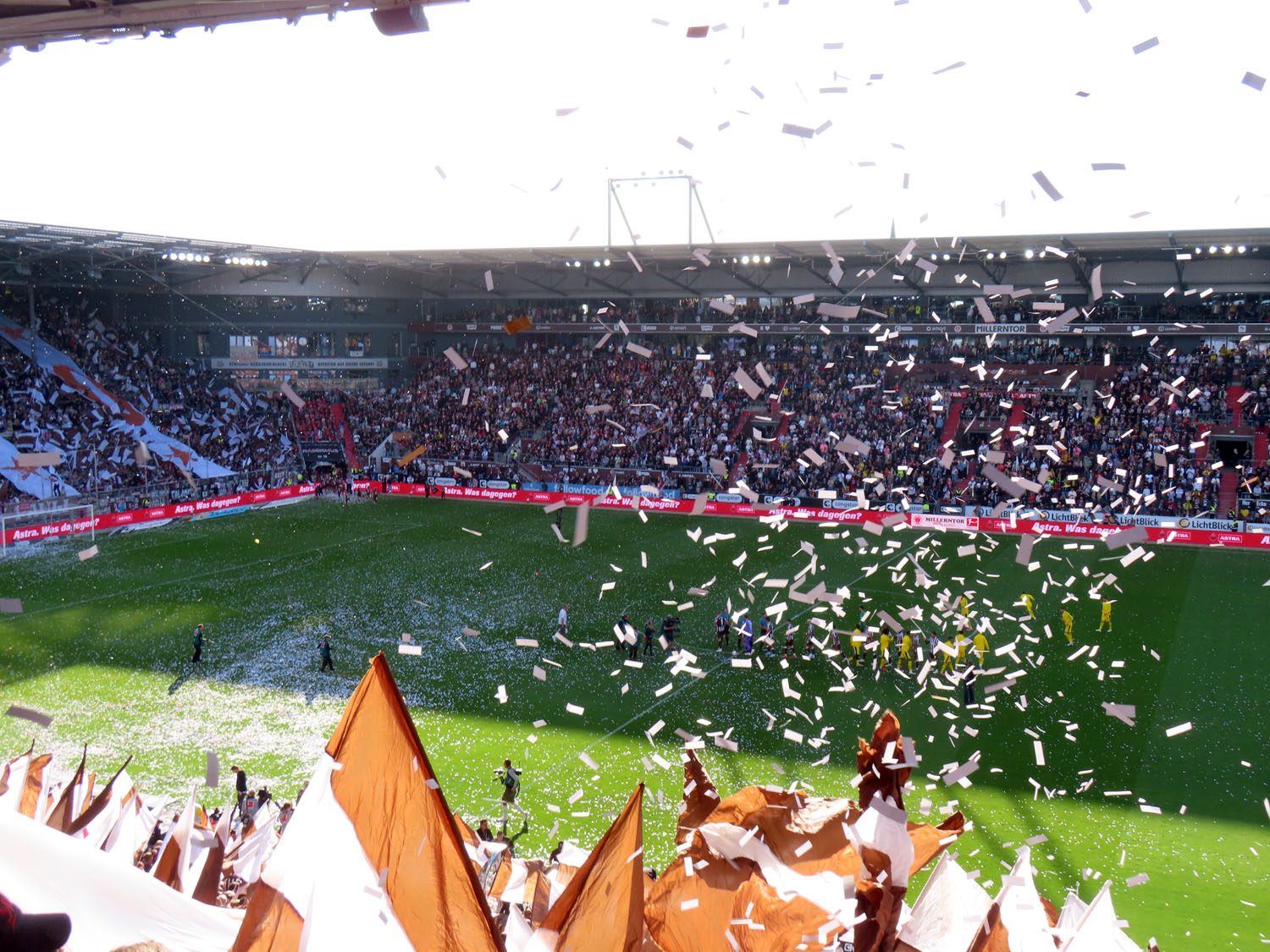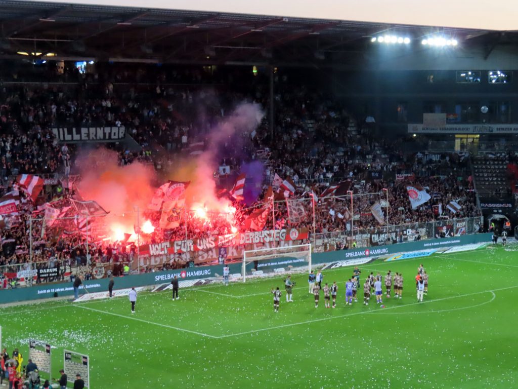 Unfaßbar viel Konfetti in jedem Fall. Am Millerntor gibt es ja immer mal wieder wahre Konfetti-Orgien, aber der vergangene Spieltag war in dieser Hinsicht einfach ein unerreichbarer Rekord. Es hätte nicht viel gefehlt und das Spiel hätte entweder unterbrochen oder mit Verspätung angepfiffen werden müssen, um all die Papieschnipsel auf dem Rasen zu entfernen – was absurderweise bei so einer harmlosen Choreo eine hohe Geldstrafe nach sich gezogen hätte, insofern haben wir da wirklich Glück gehabt.