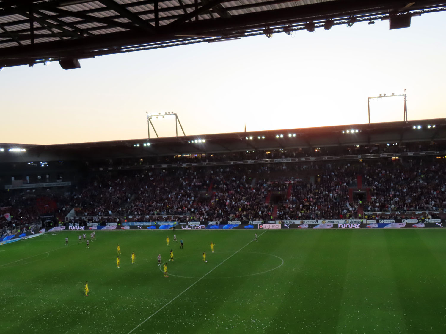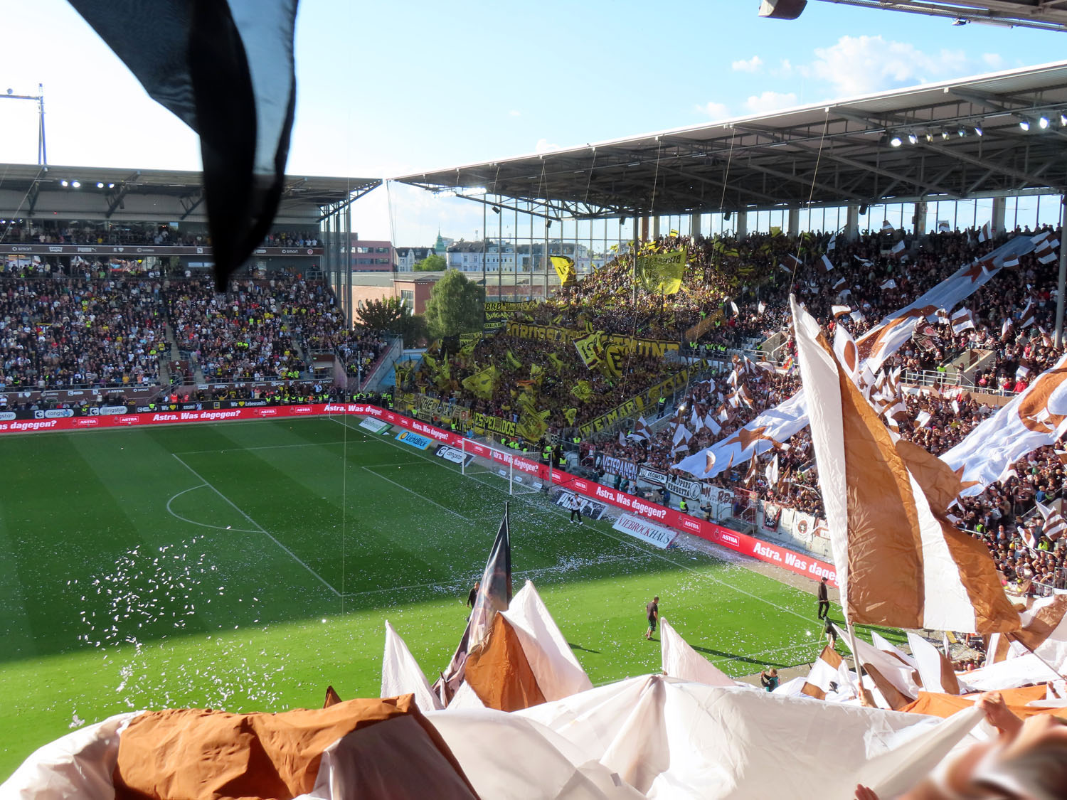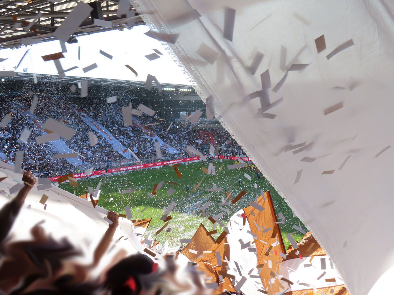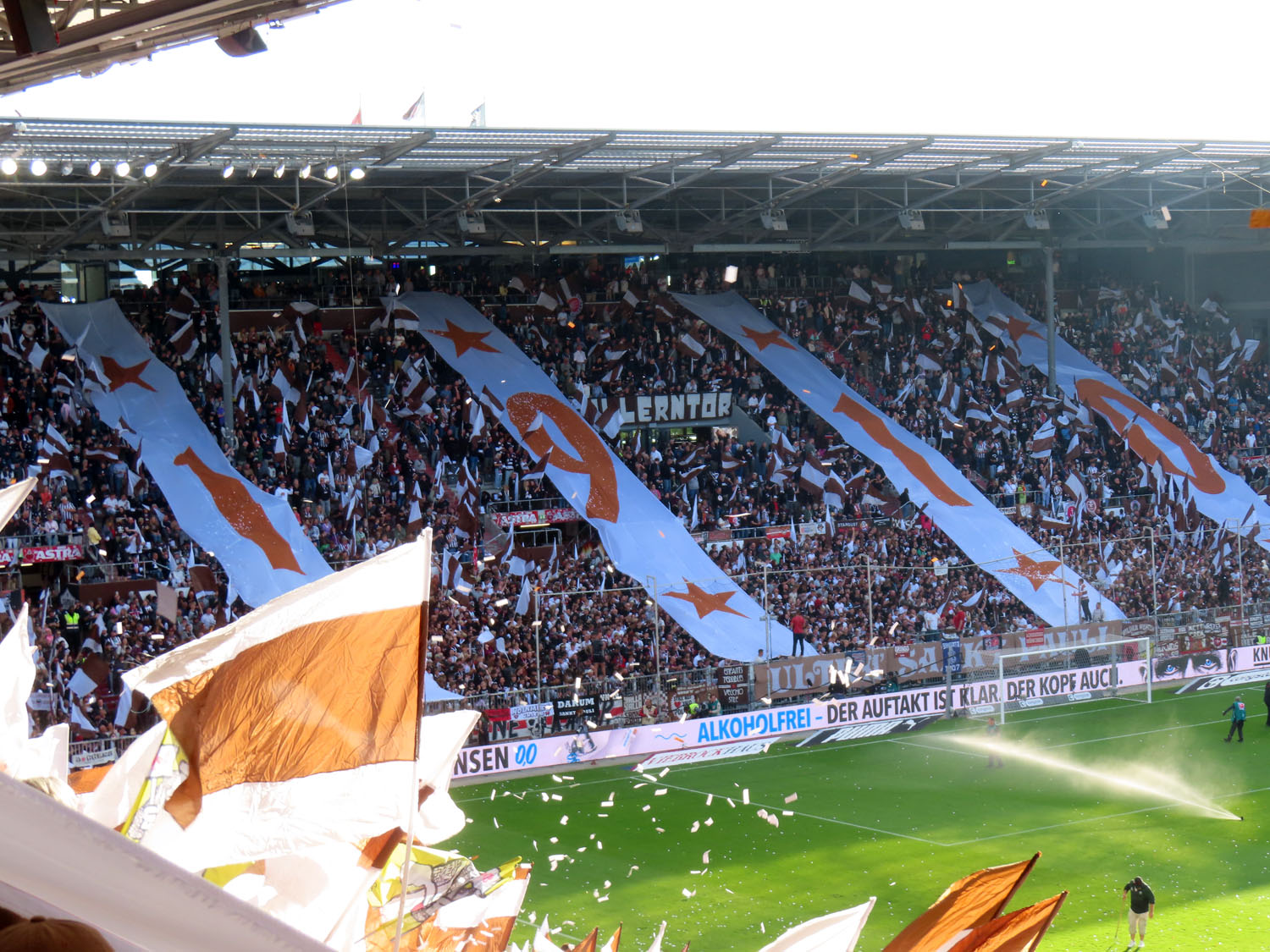 Unfaßbar viel Konfetti in jedem Fall. Am Millerntor gibt es ja immer mal wieder wahre Konfetti-Orgien, aber der vergangene Spieltag war in dieser Hinsicht einfach ein unerreichbarer Rekord. Es hätte nicht viel gefehlt und das Spiel hätte entweder unterbrochen oder mit Verspätung angepfiffen werden müssen, um all die Papieschnipsel auf dem Rasen zu entfernen – was absurderweise bei so einer harmlosen Choreo eine hohe Geldstrafe nach sich gezogen hätte, insofern haben wir da wirklich Glück gehabt.
