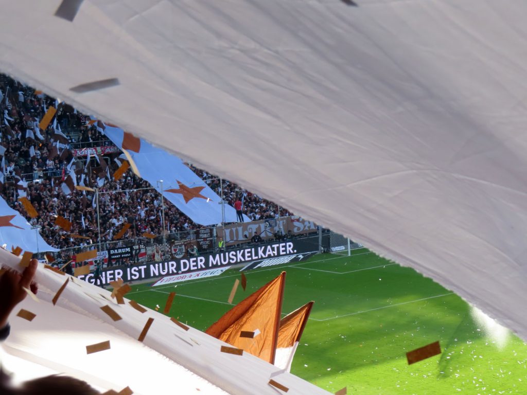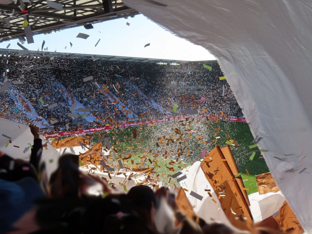 So war in jedem Fall für alle Werfenden genügend Konfetti vorhanden. Und in diesem Sinne wurde es offensichtlich auch eingesetzt. Von lange vorher bis noch lange danach, das ganze Spiel über, flog Konfetti und das in Mengen, die mehr an Schneefall als an eine Choreo erinnern sollte…