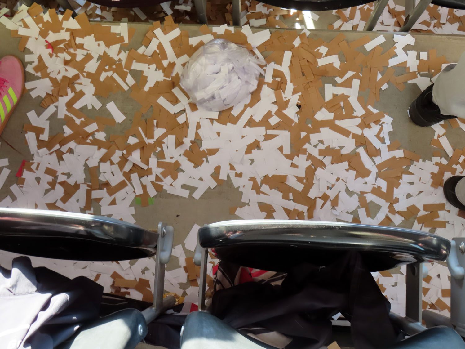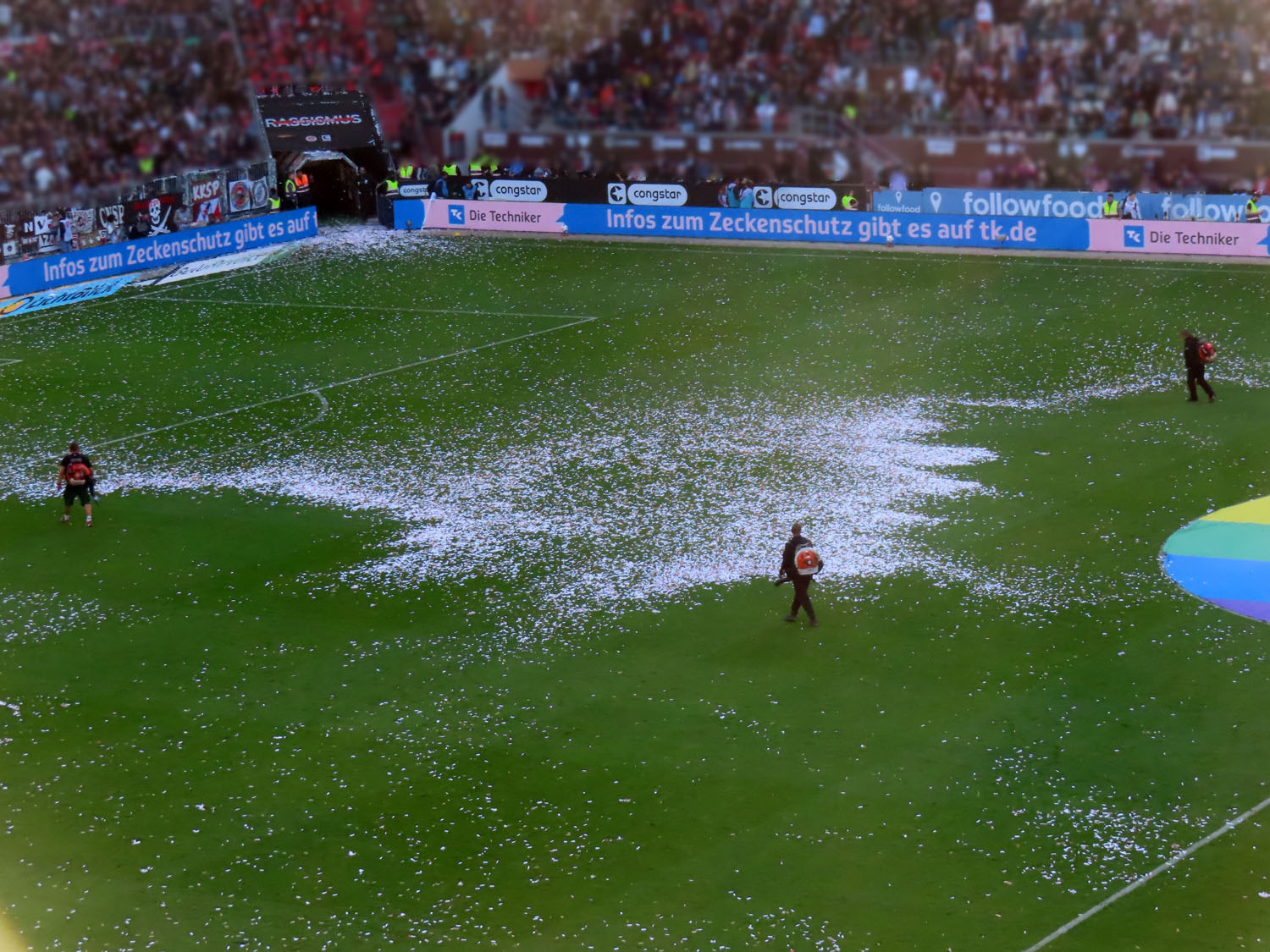 So ganz einfach war der Rasen an diesem Spieltag jedenfalls nicht, mehrfach mußten die Spieler und Schiedsrichter sich das Konfetti zwischen den Stollen herausklauben…