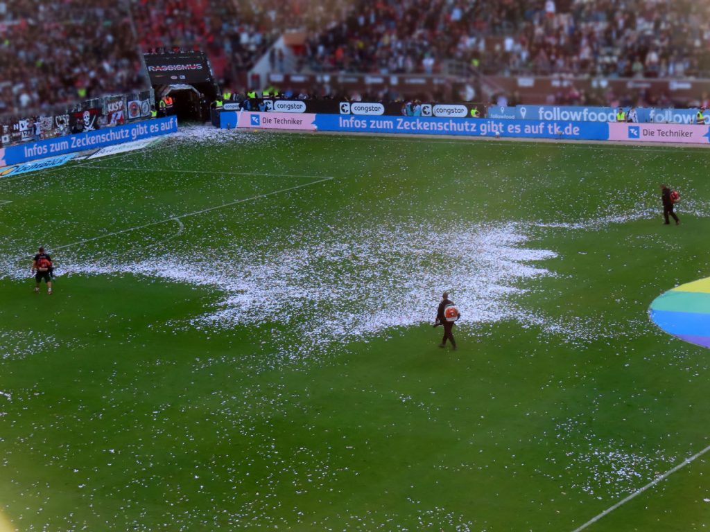 Das war schon kein Rasen mehr, den die Mannschaften betraten, das war ein Konfettimeer. Oder auch die Variante eines Hybridrasens, den die Fanszene sich unter dem Begriff vorgestellt haben mag…